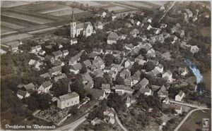 Im Vergleich zu aktuellen Aufnahmen fällt vor allem die radikale Veränderung des Ortsbilds auf. Zunächst ist da die Ausdehnung. Standen die neue Kirche und das Umspannhäuschen (links davon, kurz vor dem linken Bildrand) damals noch am Ortsrand, sind beide heute mitten in Dorchheim gelegen. Anders gesagt: Der Ort hat sich in Richtung Norden praktisch verdoppelt und dazu sind viele Wiesen- und Obstbaumgrundstücke heute bebaut, gerade um den Marienstätter Hof herum oder am rechten unteren Bildrand. Aber auch wenn man einzelne Häuser betrachtet, erkennt man die Umgestaltung. So sind die großen Fachwerkhöfe links und rechts von der Nikolauskapelle heute verschwunden und durch kleinere, moderne Wohnhäuser ersetzt.
